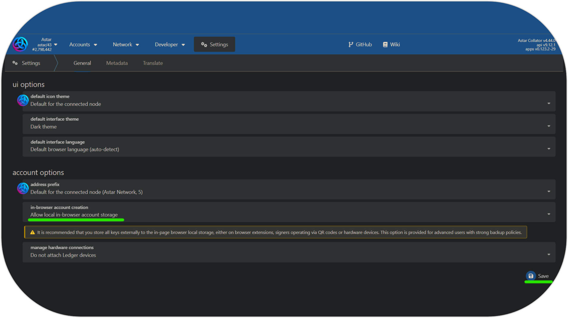 Allow use on any chain; - Your ECDSA wallet is now restored on Polkadot{.js} and you can use it with Astar Portal.