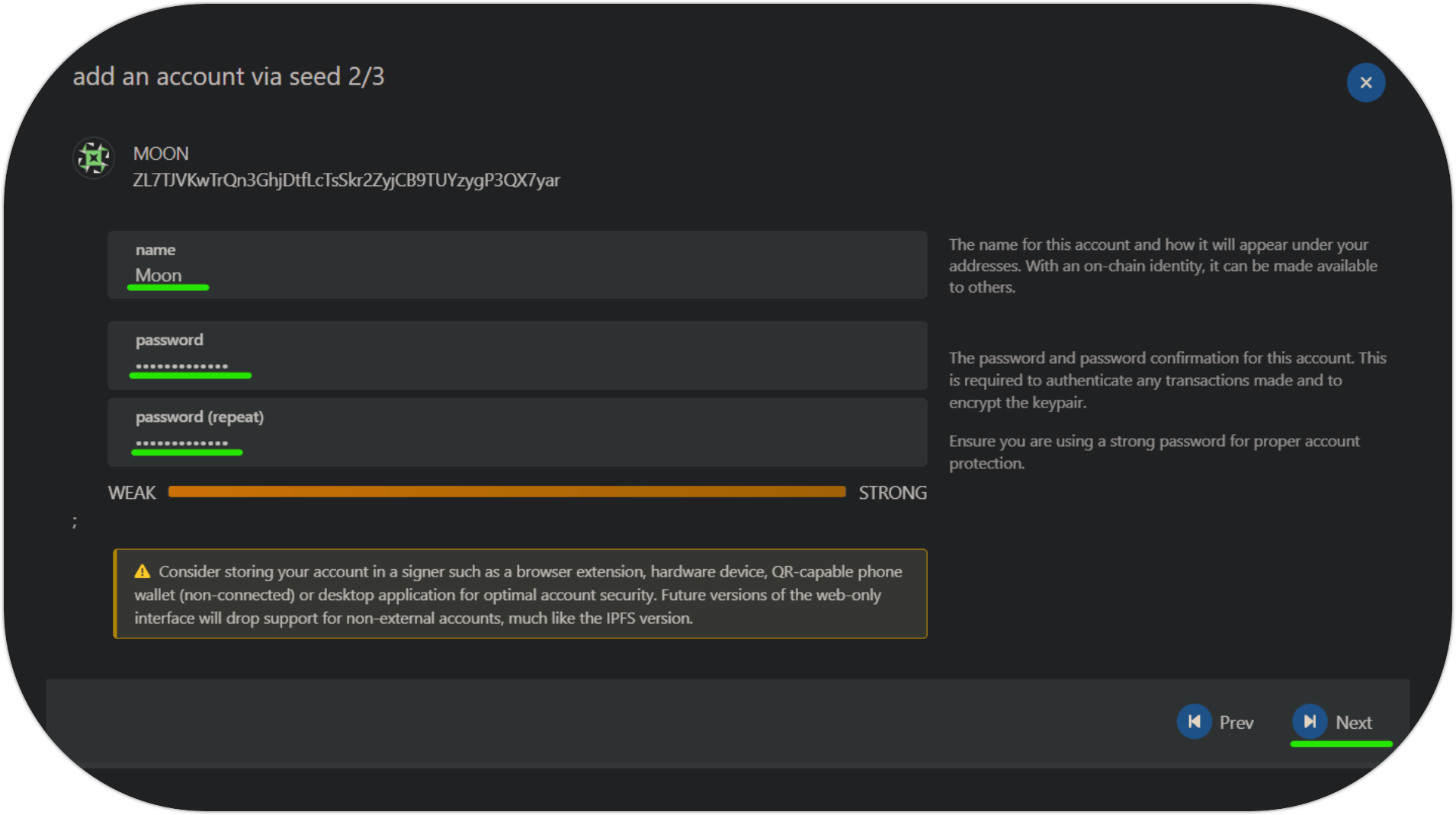Restore; - The wallet is now restored on the Polkadot{.js} extension;