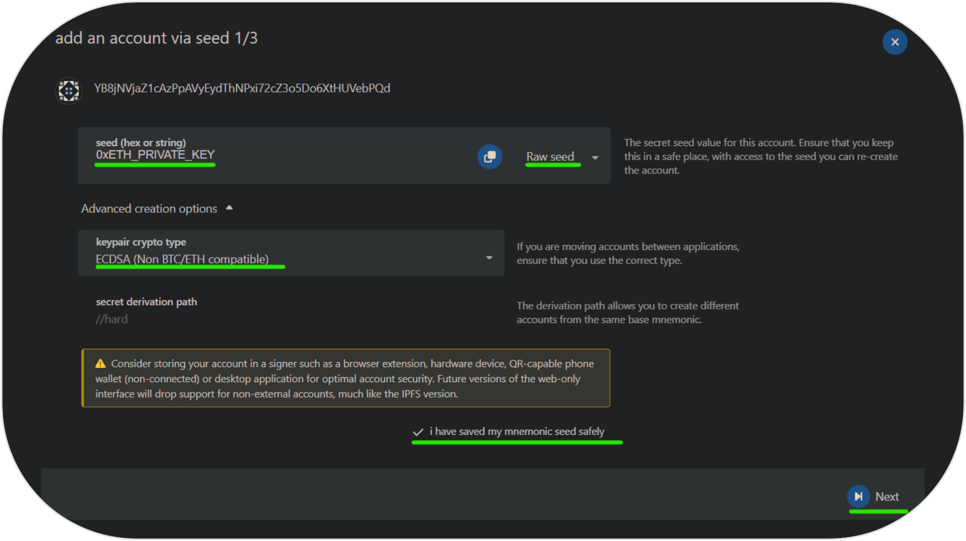 ECDSA; - On the SEED box, type 0x and paste your ETH private key;