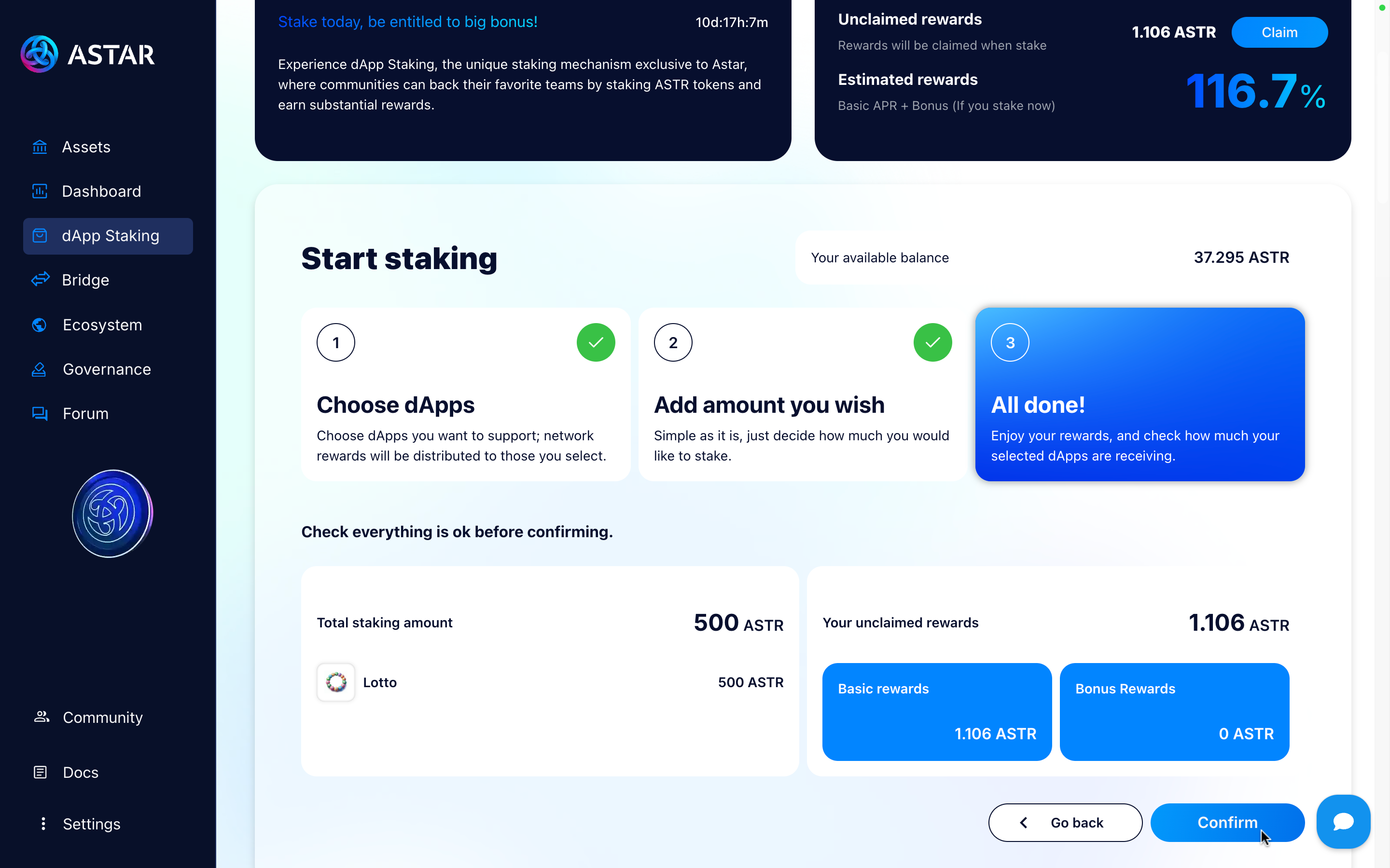 If you go to the My dApps section, you’ll be able to see the different dApps you staked on and their respective amounts.