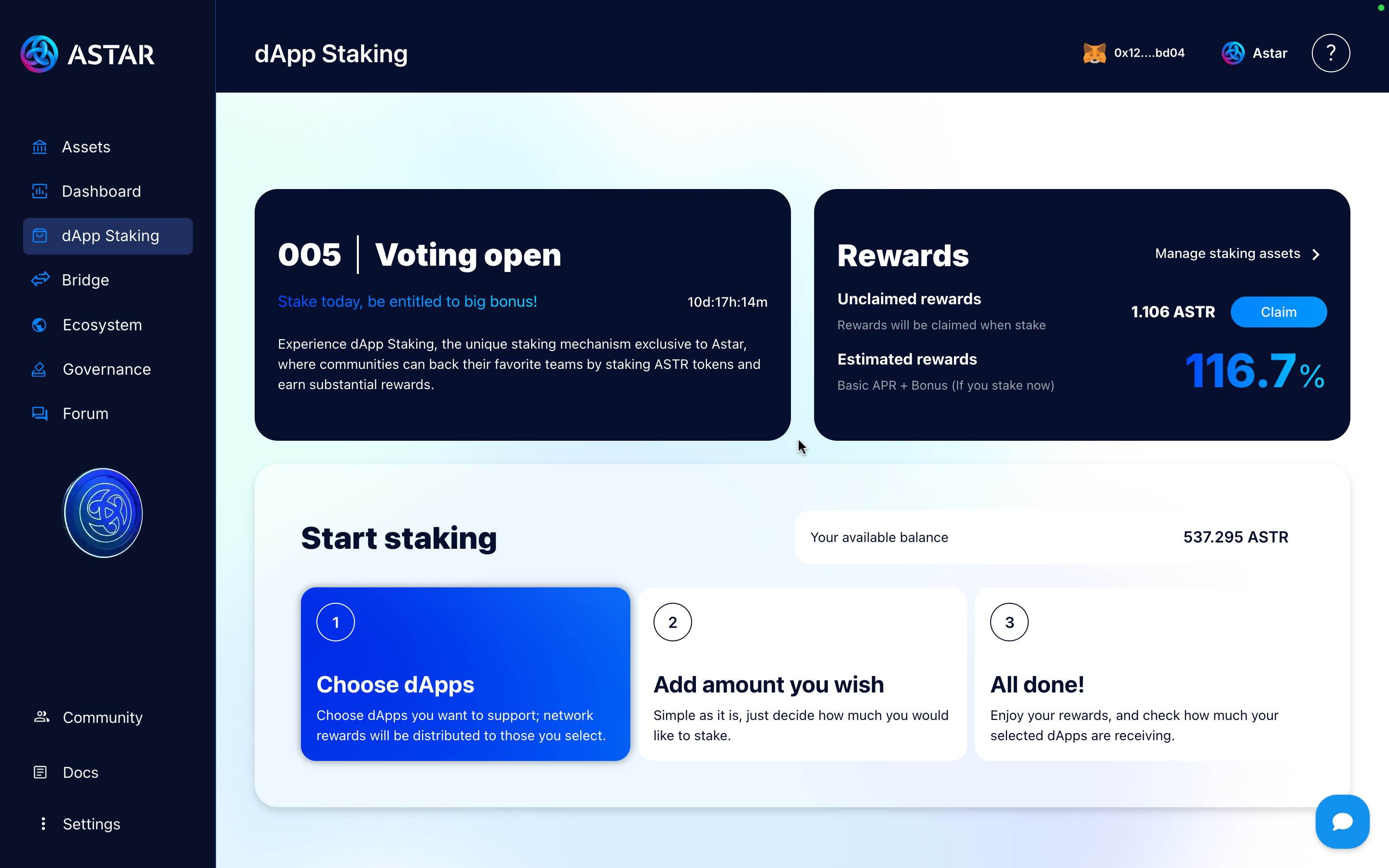 You can start staking either by clicking the blue "Choose dApps" button or by scrolling down to view all the listed dApps.